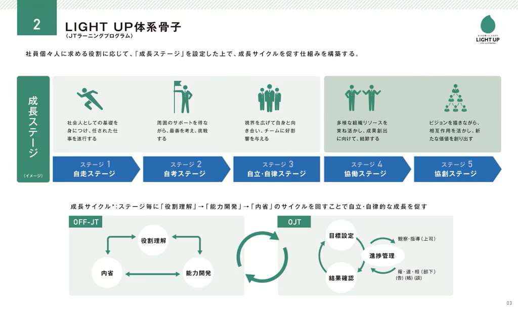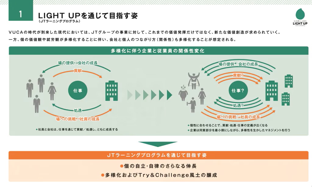 JT 中島氏:今後は、この成長支援体系「LIGHT UP」を通して、研修の案内が来たから受ける、というルーティンではなく、会社としてのメッセージを理解するきっかけにしてほしいと思っています。そして勿論、その理解を土台にしつつ、社員の皆さんが成長のサイクルをご自身で回していけると理想的ですね。
