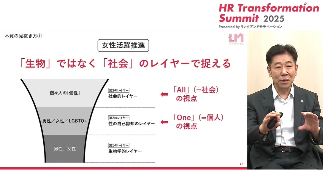 このテーマは、スライドのようにレイヤーに分けて考えたいと思います。1段目が「生物学的レイヤー」、つまり生物学的な男性・女性というレイヤーです。2段目のレイヤーは「性の自己認知のレイヤー」で、男性・女性だけでなくLGBTQ+といった性の自己認知が含まれます。これは「One(個人)」の視点であり、それぞれの自己認知は尊重されるべきです。3段目が「社会的レイヤー」で、「All(社会)」の視点です。社会全体という視点で見れば、性別は関係なく多様な「個性」が活かされることが社会の発展につながります。