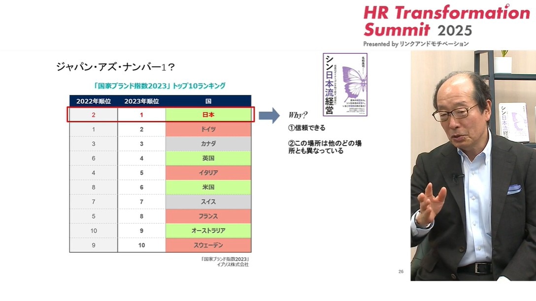 一橋大学大学院 名和氏:1979年に『ジャパン・アズ・ナンバー1』という本が出版されました。当時はまさにナンバー1だったわけですが、その後成長が鈍化していきました。しかし最近では、国のブランド力を文化や観光、統治など6分野で評価する国際調査『ナショナルブランドインデックス(NBI)』のランキングにおいて、日本は1位になっています。