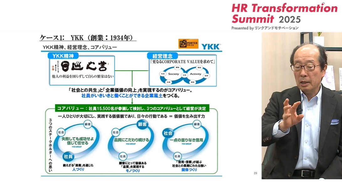スライドの下にある「3つのコアバリュー」には順番があります。まず社員から始まり、次に顧客に共感が広がり、その後、社会に受け入れられる。この順番が大事だというのがYKKの教えです。これって実は、江戸時代から日本がずっと守ってきた「三方良し」と同じ順番なんですね。売り手良し、買い手良し、世間良し。この順番で善の循環を広げていくのがYKKの信念であり、まさに「シン日本流」のやり方だと言えます。