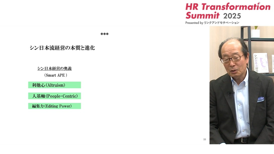 最後に、「シン日本流とは何か?」を簡単にまとめます。私は3つの要素があると考えています。1つは「利他心」。自分だけではなく周りを豊かにし、幸せにすることです。もう1つは「人基軸」。今日のテーマでもありますが、やはり人が軸であることが大事です。3つ目が「編集力」。これは、全体を見渡して編集する力です。