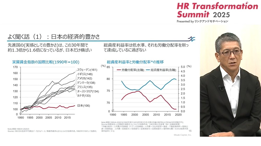 右側のグラフは、純資産利益率と労働分配率の推移です。なぜ日本が貧しくなってしまったのかというと、やはり企業の「稼ぐ力」に問題があります。ここではROA(総資産利益率)を取っていますが、日本企業はずっと低位で横ばいです。その中で労働分配率はどんどん下がってきている。そのため、経済的な豊かさを実感できない状況になっているということです。