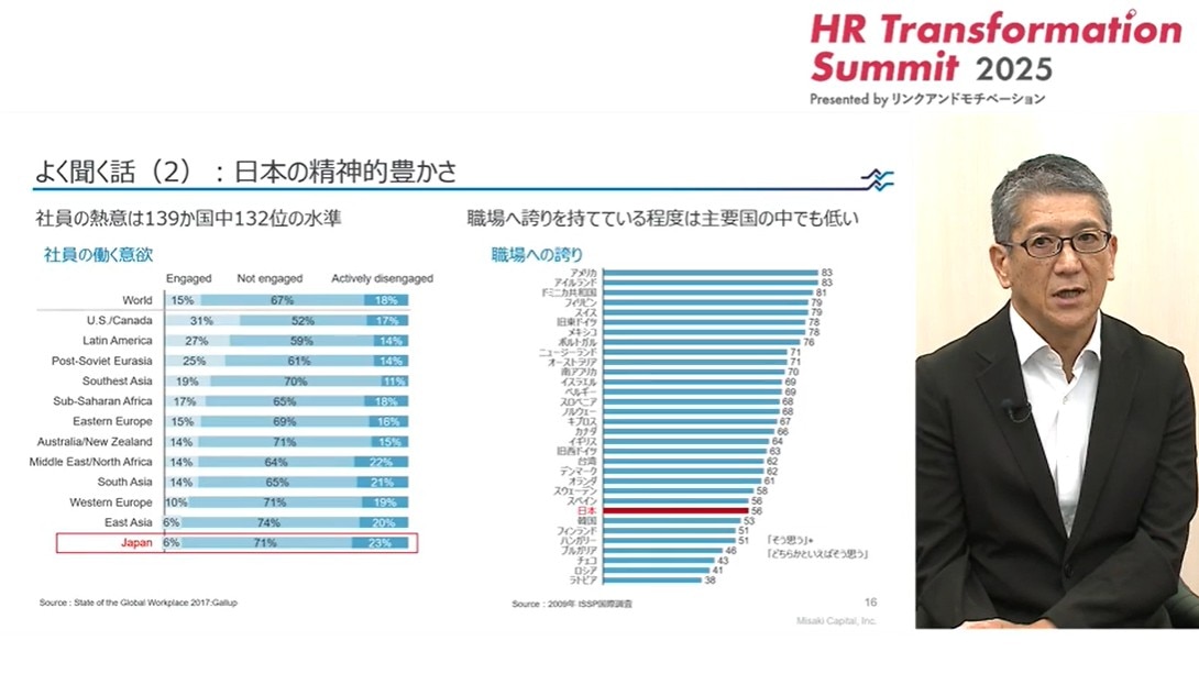 一方で、精神的な豊かさはどうでしょう。かつて、日本の会社は、社員の熱意が高いとか、職場に誇りを持っているとか、そういった姿があったように思います。しかし、最近のデータを見ると、働く意欲も職場への誇りも低いという結果が出ています。つまり、経済的にも精神的にも豊かさが失われてきているのが現状です。