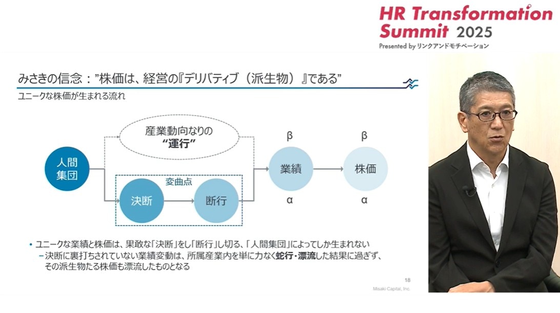 決断に裏打ちされていない業績変動は、所属している産業内を力なく蛇行したり漂流したりしているに過ぎず、たまたま良い業績が出ることはあっても、それは単にβの業績であり、株価もβの株価に過ぎません。これが、20年間投資業に携わってきて、あらためて気づかされたことです。だからこそ「企業価値向上の分岐点は人にある」と強く思うのです。