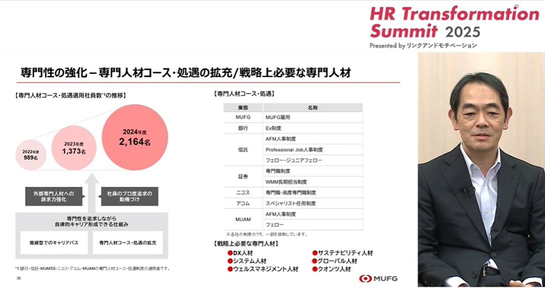 まず「プロ度追求」です。一人ひとりの従業員が専門性を高め、キャリアを深掘りしていくことはもちろんですが、金融業務は非常に多様化・高度化しているため、外部人材の採用を含めて、プロフェッショナルを増やしていくことが重要になっています。そこでMUFGでは、銀行や信託、証券など6つの業態それぞれに「プロ制度」を設けています。DX、サステナビリティ、システムなど、戦略上、必要性の高い分野を中心にプロ認定を行っています。