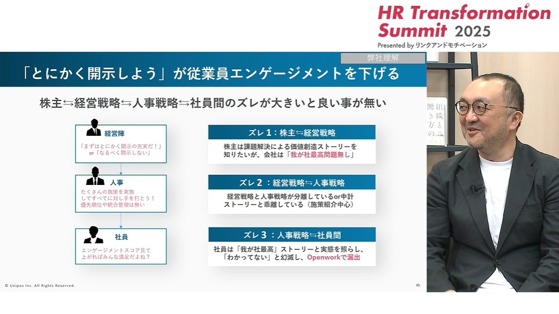 とはいえ、株主に対して説明する必要があるわけですが、経営陣が「とにかく開示しよう」という姿勢でいると良いことはありません。「我が社最高問題なし」というような開示をする企業は少なくありませんが、現場の従業員から「いや、結構パワハラあるよね」といった声が出ると、メッセージにズレが生まれてしまいます。このズレが生じないようにすることが重要ですが、現在はここがズレている会社が多いように思います。