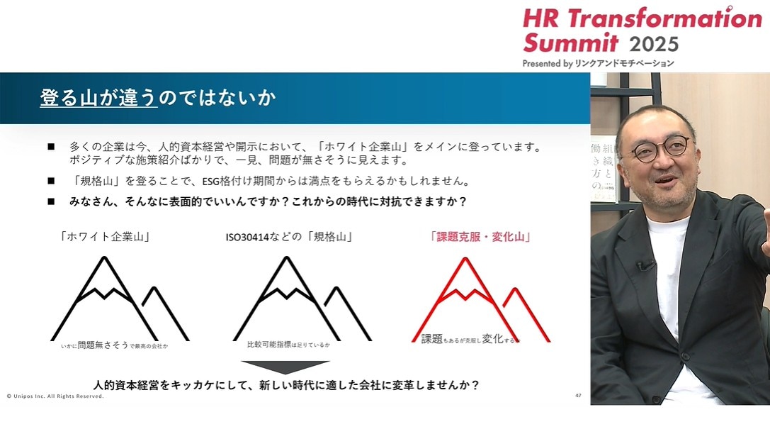 私は、いちばん右の「課題克服・変化山」を登るべきだと考えています。人的資本開示を通して、課題をどう克服し、どう変化していくのかを語るのです。そういった開示をしないと、極めて表面的で教科書的な開示に終わってしまいます。