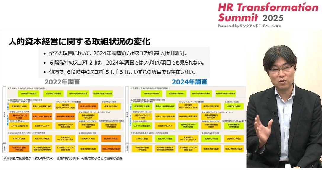 左が2022年調査の結果、右が2024年調査の結果です。2022年は、人的資本経営の「重要性を意識していない」、あるいは「重要性は認識しているが何もやっていない」という企業が多くありました。しかし、2024年は、「具体的に対応策を検討している」、あるいは「対応策を実行している」という企業の数が増えています。人的資本経営の重要性がある程度浸透し、取り組みに着手した企業が増えているのが全体像かと思います。