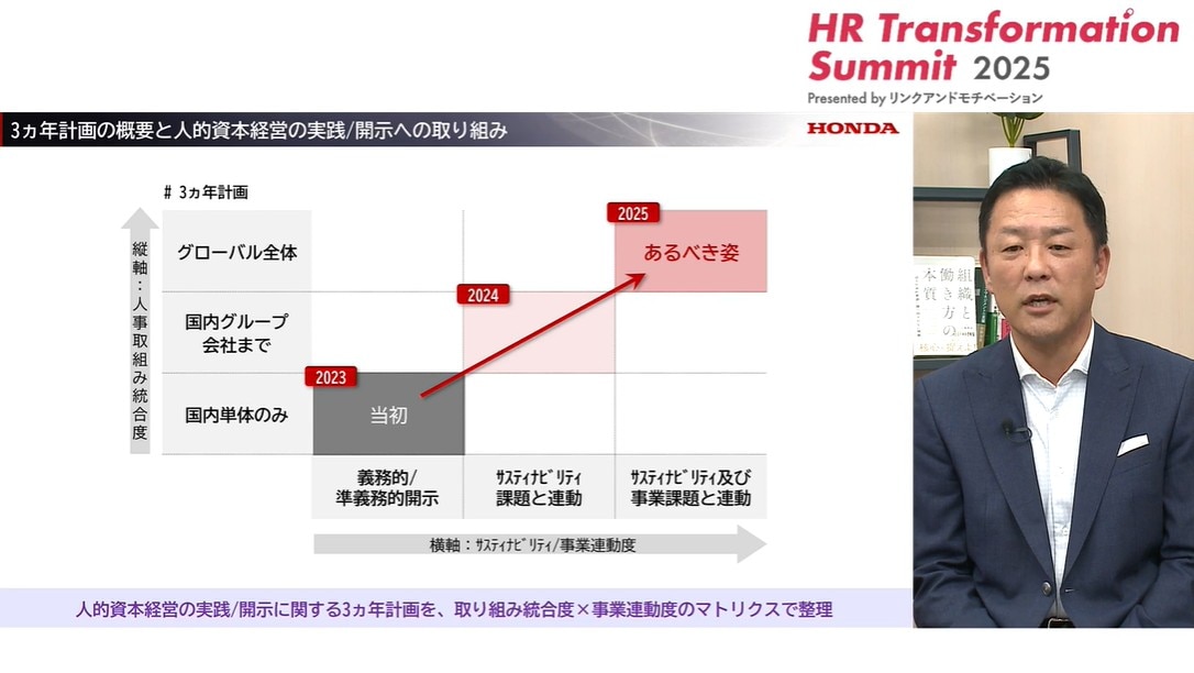 ここからは、Hondaの人的資本の取り組みについてご紹介します。まず「開示」の話になりますが、2023年にマトリクスを用いて、今後の人的資本経営の実践と開示の在り方を整理しました。