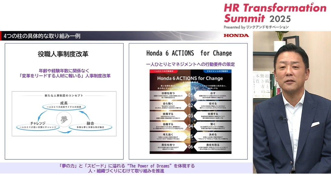 こうした施策に加えて、企業風土を強化する取り組みも始めています。その一例が、「役職人事制度の刷新」です。年齢・経験年数に関係なく、その人の努力や実力、成果に正しく報いる制度に改めました。また、「Honda 6 ACTIONS」という新たな行動指針を設定しました。特徴的なのは、右側にマネジメントに求められる6つの行動要件を示し、左側にはマネジメントを受ける側を含め、全社員に求められる6つの行動要件をまとめている点です。