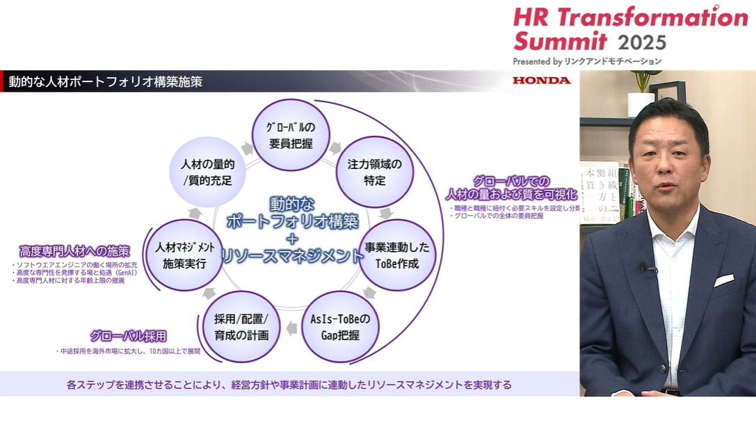 このフレームワークに沿って、いくつか具体的なポイントをご説明します。まず、パーパスの再定義です。Hondaは元々フィロソフィードリブン、理念ドリブンの会社ではありますが、第二の創業期を迎えるにあたり、パーパスの再定義を行いました。また、パーパスの再定義を踏まえて、事業ポートフォリオと人材ポートフォリオの見直しを行っています。事業については、これまでのように移動体としてのモビリティの提供にとどまらず、今後はインフラや周辺サービスまで含めて、より広いスコープで新しい価値を提供していこうというものです。それに伴い、人材ポートフォリオの見直しも必要になります。当然ながら、未経験の領域が多い中で、社内にケイパビリティがあるのか、また必要とされるスキルの重要性や希少性を踏まえ、それを自社で持つべきなのか、あるいは外部に求めるべきなのか整理し、人材ポートフォリオを設計しました。