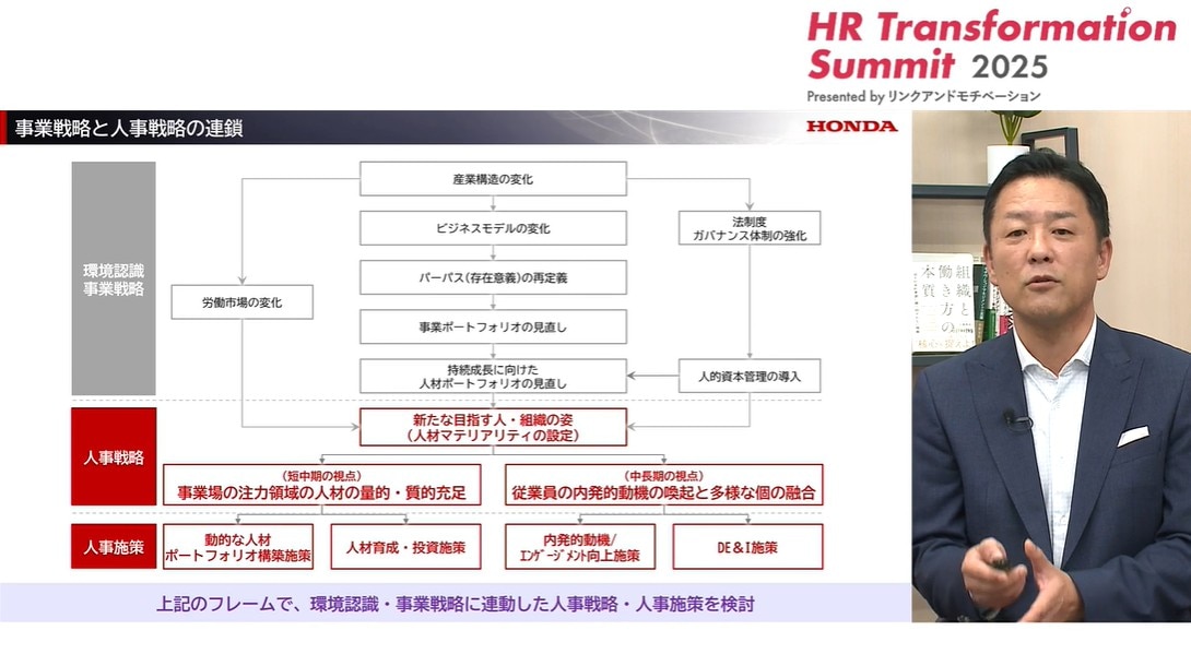 次に、事業戦略と人事戦略の連動性についてですが、まず事業環境の認識や未来予測があり、それを踏まえて、Hondaとしての経営戦略や事業戦略があります。その戦略に連動する形で人事戦略を立て、さらに個別の人事施策へと落とし込むというフレームワークで進めています。