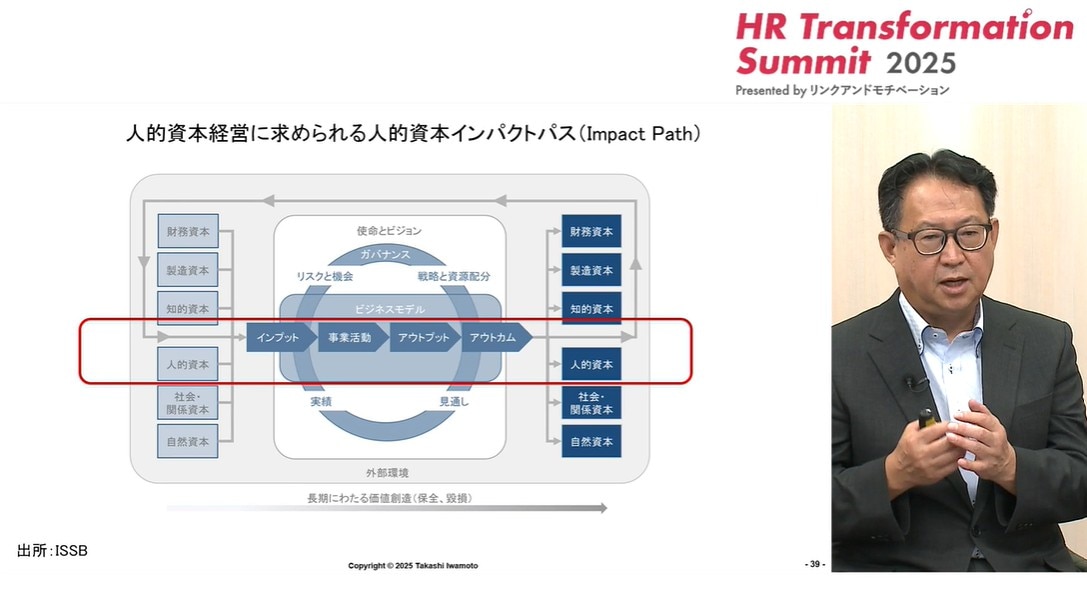このスライドは、統合報告書のフレームワークです。人的資本をインプットして、アクティビティ(事業活動)をして、アウトプット(事業成果:売上や利益)を生み出し、アウトカム、つまり社会的インパクトにつなげましょうという話です。これをぐるぐると循環させるのが「人的資本インパクトパス」ですが、社内的にも社外的にもインパクトパスをつくっていくことが求められています。