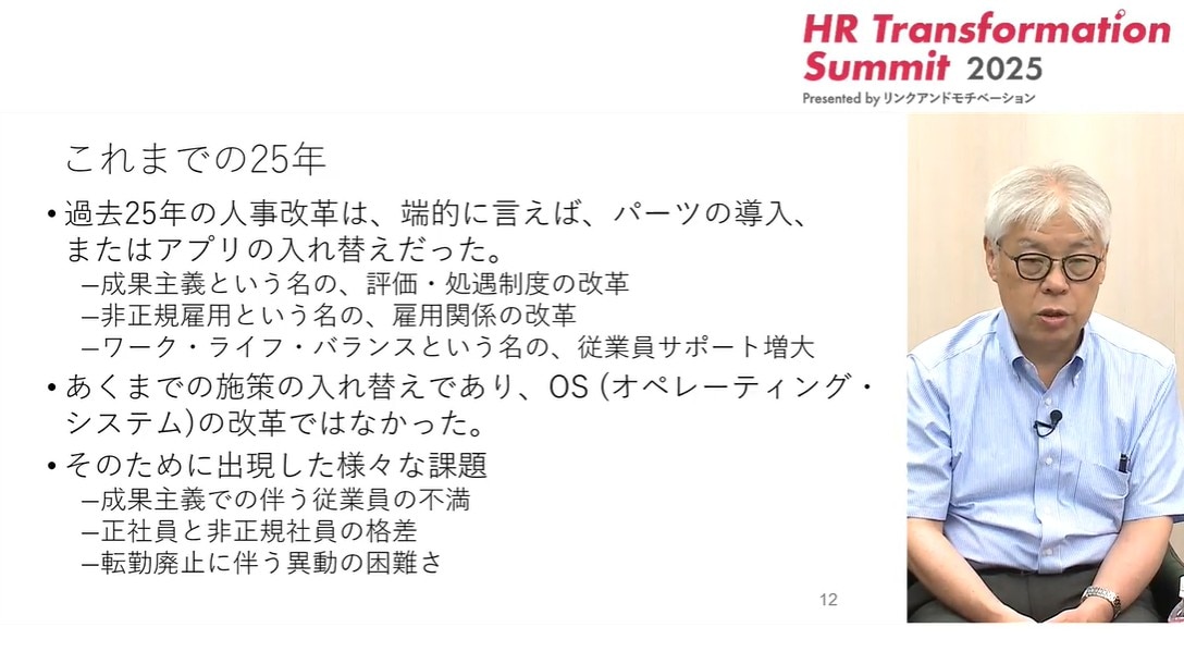 学習院大学 守島氏:私は長く日本の人事を見てきましたが、この25年を振り返ると、ある意味で「アプリの入れ替え」をしてきた期間だったと思います。日本型雇用システムという人事の大きなOSはほとんど変えず、その上にいろんな新しいアプリを載せてきました。代表的なのは「成果主義」ですね。「非正規雇用の拡大」や「ワークライフバランス」も一つのアプリだと言えるでしょう。