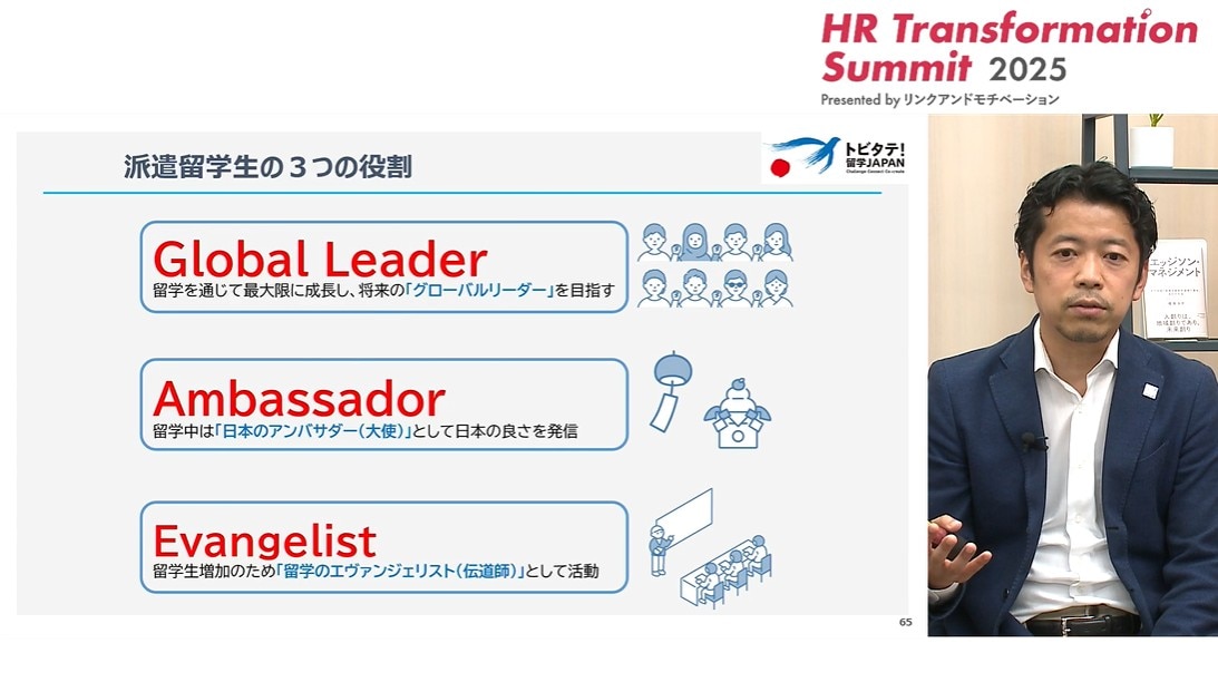 「Global Leader」は文字どおりですが、留学を通じて最大限に成長し、将来のグローバルリーダーを目指すことです。「Ambassador」というのは、日本の良さを世界へ発信することです。日本の魅力や地元の魅力を、日本の「大使」として発信してもらう役割です。そうすることが、留学生が世界とつながるきっかけになったり、自分自身の文化に自信を持つきっかけになったりします。最後に「Evangelist」とありますが、これは留学して「自分だけが良かった」で終わらせず、帰国後に留学の良さを周りの友だちや後輩、もしくは地元に伝え留学機運醸成に貢献する役割です。