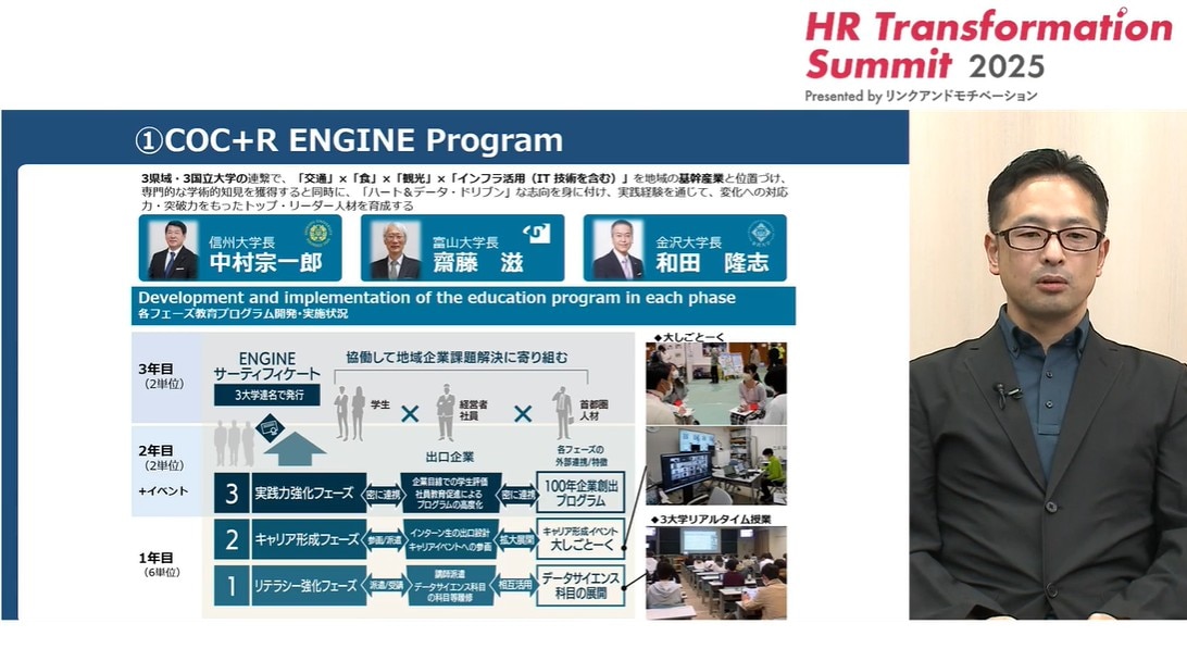 リンクアンドモチベーション 樫原:本セッションは「ともに育つ地域と組織~産官学連携が生む未来~」というテーマで進めてまいります。地方創生と言っても様々なアプローチがありますが、今回は「人・組織」という観点から考えていきたいと思います。早速ですが、信州大学の林先生、「学」の視点からプレゼンテーションをお願いします。