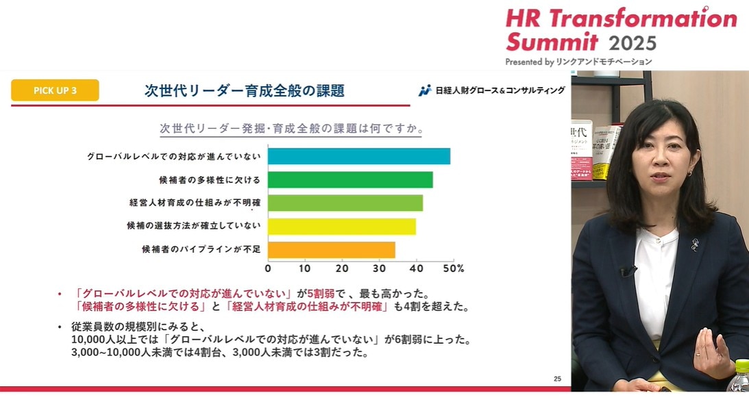 最も多かった回答は「グローバルレベルでの対応が進んでいない」というもので、5割弱に上っています。調査結果の詳細を見ると、製造業では8〜9割に達する勢いです。さらに興味深いのは、以前の調査でも同様の設問を置いていたのですが、当時はグローバル人材育成に関する課題はもっと順位が低かったんです。おそらく、経営に近い方の視座・視野で見ると、グローバルレベルでの対応の遅れがより鮮明な課題として映るのだろうと考えられます。