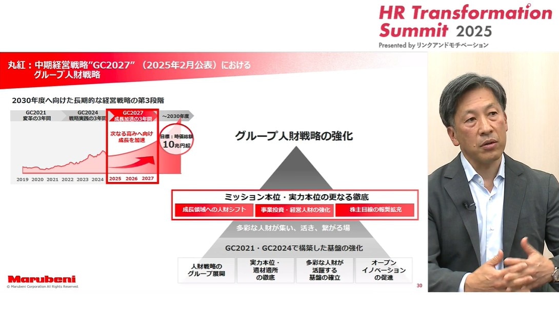 その中で、グループ人財戦略をどうするのかというのが、右側のピラミッドです。これまで2回の中経(GC2021、GC2024)で取り組んできたことは土台として残しつつ、「ミッション本位・実力本位の更なる徹底」という方向性で進めていくことにいたしました。中でも、「成長領域への人財シフト・人財投資」「事業投資・経営人財の強化」「株主目線の報奨拡充」という3つを重要な方針として掲げています。