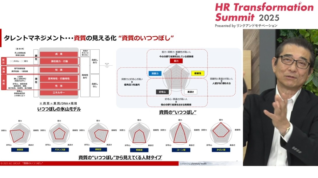 次に、タレントマネジメントについてご説明します。人材のバリューは、経験から得られる知識、スキルといった能力のほかに、もう一つ重要な要素があります。それが「資質」です。よく氷山モデルで説明されますが、一番上に成果を支える能力があり、その下に知識があり、一番下に潜在的でなかなか見えにくい資質があるというイメージです。当社では社員の資質を5つに絞り、「資質のいつつぼし」として可視化しています。