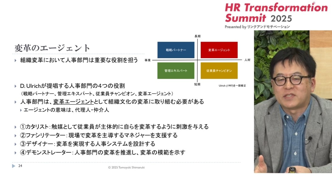 こちらに4つの例を挙げていますが、まず「カタリスト」として従業員が自ら変革していくように刺激を与える役割です。また、「ファシリテーター」として現場のマネジャーを支援する役割も求められます。さらに、人事システムを設計する「デザイナー」の側面もあります。そして、人事部門という自らの組織を変革し模範を示す「デモンストレーター」としての役割もあります。このように、人事部門は変革エージェントとしていくつかの役割を担っていく必要があります。