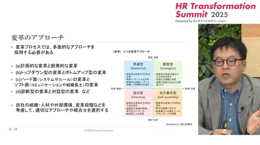 こちらのスライドに例を挙げているとおり、組織変革には様々なアプローチがあります。重要なのは、自社の状況、外部環境、内部環境を正しく認識し、変革の段階を踏まえて適切なアプローチを選ぶことです。状況に応じて、いくつかのアプローチを組み合わせて進めることが必要になります。