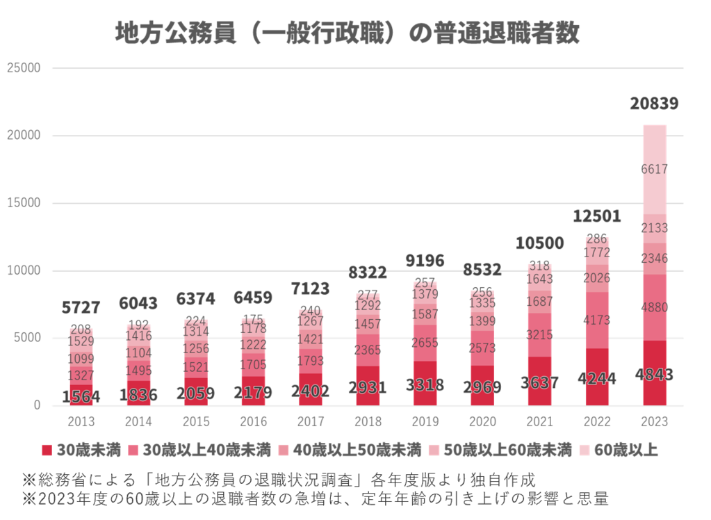 さらに、組織への定着においても課題が山積しており、地方公務員・国家公務員ともに30代以下の若手職員の退職率は増加傾向にあります。これらは自治体組織の持続可能性に関わる深刻な課題となっています。