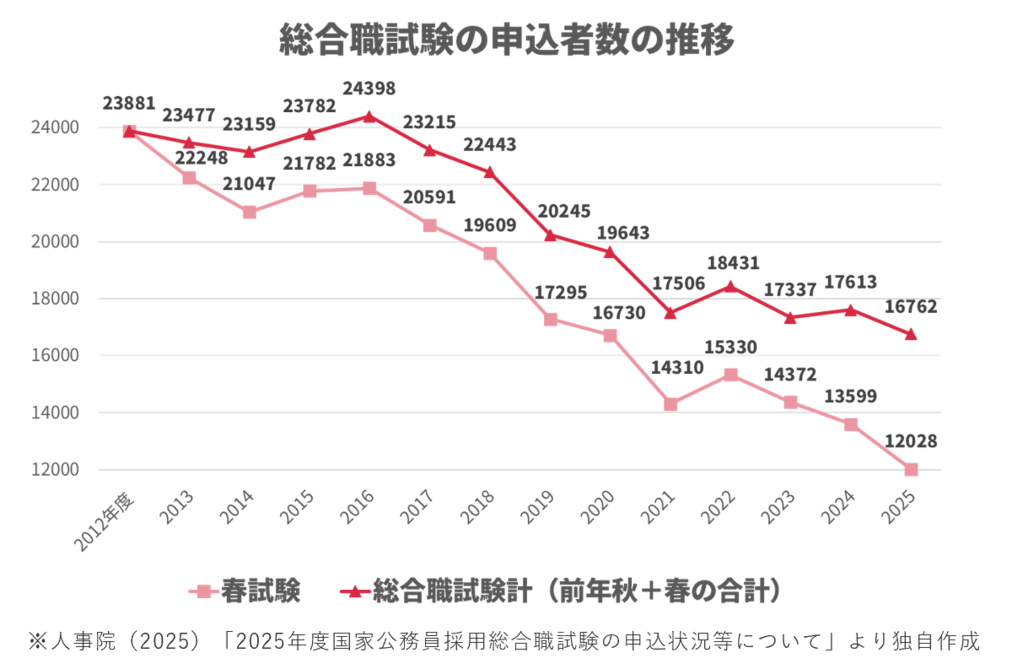 特に自治体においては、この流れがより顕著に現れています。公務員試験の申込者数は減少傾向にあり、国家公務員採用総合職試験においては、毎年約4%ずつ申込者数が減少しています。