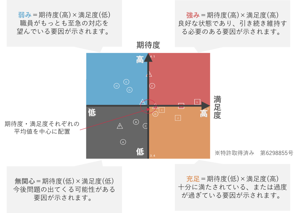 当社のエンゲージメントサーベイにおける調査項目は学術的観点に基づいて設計されており、組織課題等の抽出の抜け・漏れを防ぐために網羅的な16領域32項目の設問で構成されています。また、行政向けの設問も2022年の9月に開発し、行政職員の皆様が回答しやすい設問文面で設計しております。満足度に加え、期待度を活用することで、職員の現状認識が分かるため、優先して対処すべき課題が明確になります。職員は満足を高める対象としての「お客様」ではなく、共に良いまちづくりを行っていく「仲間」です。何を大切にして活動していくかの期待がすり合っていることが重要です。