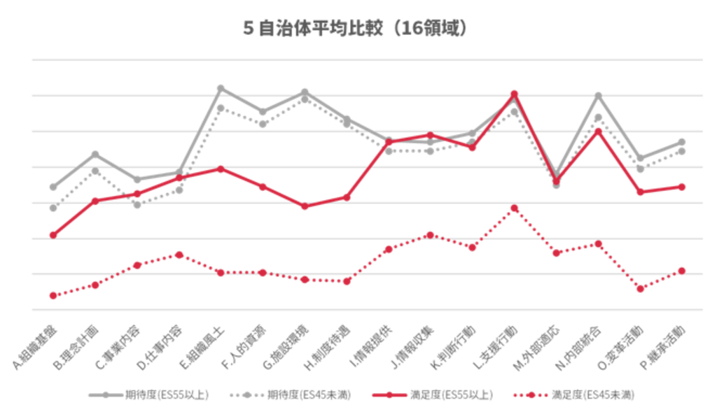 下図は、エンゲージメントと退職率との相関が見られる5自治体のデータを基に、当社のエンゲージメントサーベイにおける16領域の調査項目の回答を平均したものです。ここで使用するエンゲージメントスコア(以下ES)は、世の中の平均を50とした偏差値を指します。今回は課単位でデータを分析し、ESが55以上の「高ES組織」と、ESが45未満の「低ES組織」に分け、それぞれの平均値を16領域別にプロットしました。