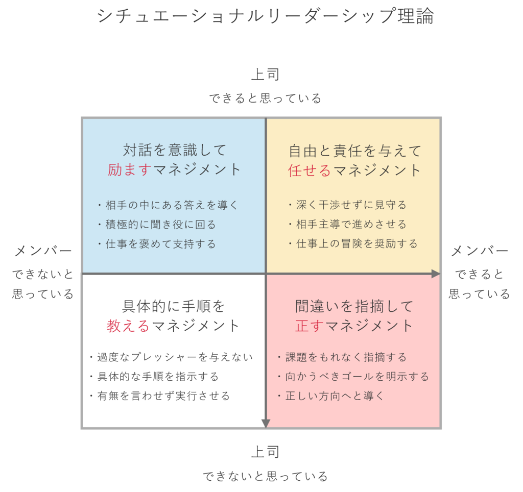 部下への効果的な関わり方を考える上では、「シチュエーショナルリーダーシップ(SL理論)」が参考になります。SL理論では、上司がメンバーの育成を行う上で、「状況にあった関わり方をすること」が大切だとされています。すなわち、タスクごとに上司の「メンバーができると思っているか」という認識と、メンバー自身の「自分にできると思っているか」という認識の2軸で状況を整理し、関わり方を変えるという考え方です。このSL理論を踏まえた関わり方のポイントは以下の通りです。