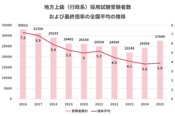2016年度と2025年度を比較すると、都道府県庁の地方上級(行政系)採用試験の平均倍率は約7.2倍から約3.9倍に低下しています。これは競争環境の緩和ではなく、2023年度までの受験者数減少と、団塊の世代の定年退職に伴う採用予定数の増加に起因しています。