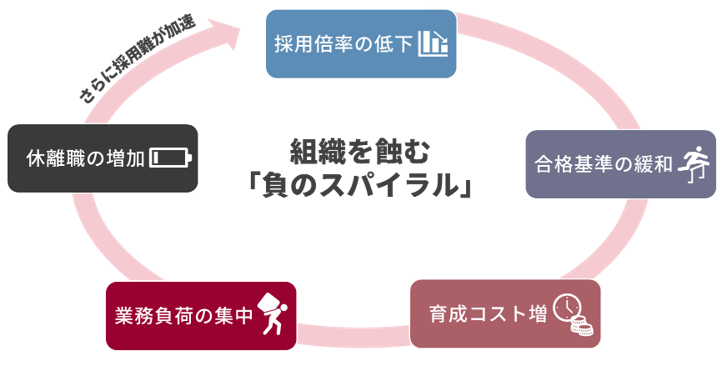 採用倍率の低下は、組織に負のスパイラルを引き起こす引き金となり得ます。