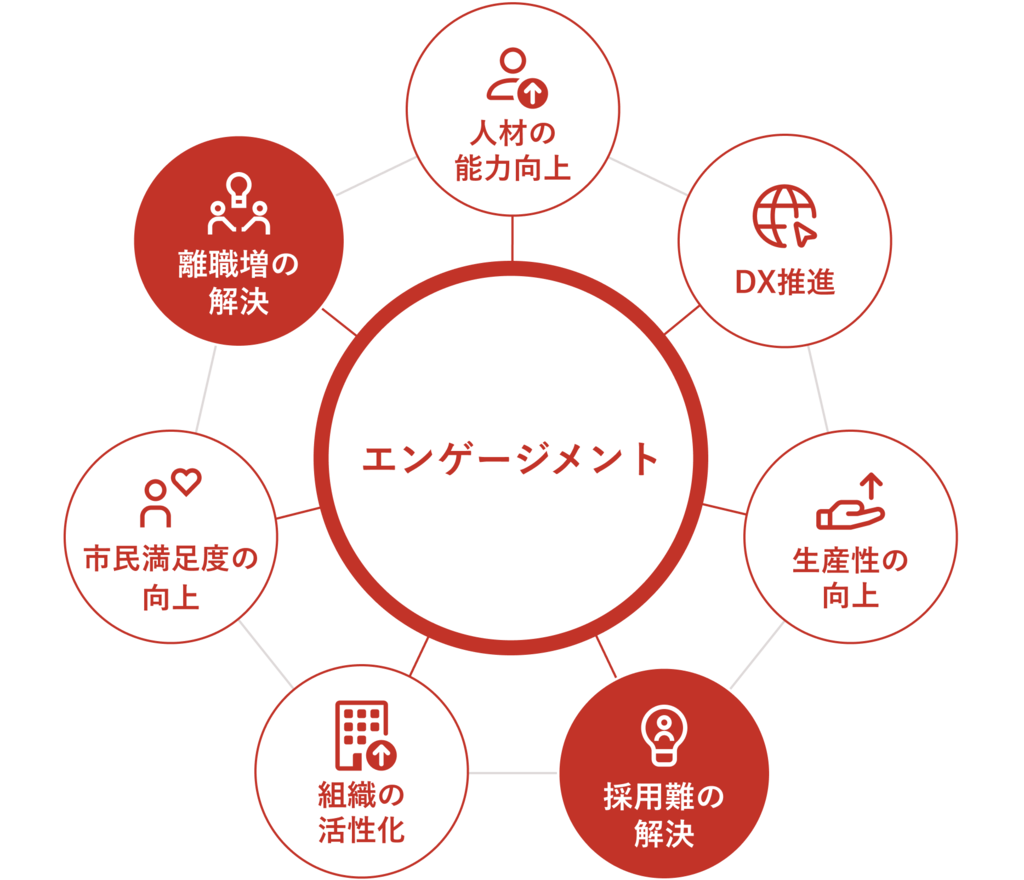 エンゲージメントとは、行政組織と職員の「相互理解・相思相愛」の度合いです。労働生産性や休職率、退職率との相関が示されております。エンゲージメントが低い組織では、どんなにいい人材やシステムを入れてもなかなか機能しません。モチベーションクラウドは、組織のエンゲージメントを可視化し、採用難・離職増の解決を支援します。